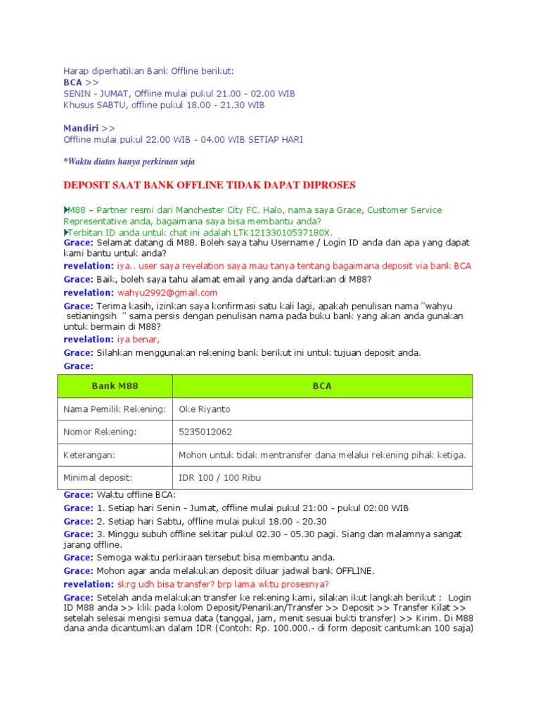 Jadwal Bank Offline BCA, Mandiri, BNI, BRI, CIMB dsb. Jika dalam keadaan darurat, Anda masih tetap bisa melakukan transfer. Tentunya, cara yang dilakukan adalah dengan verifikasi manual. Anda, wajib menghubungi admin terlebih dahulu. Kirimkan bukti transfer, dan kami akan memverifikasi informasi tsb.