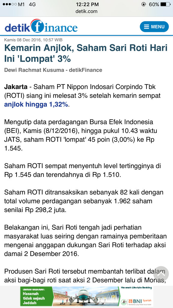 Beredar kabar di media sosial yang menyebutkan bahwa Saham PT Nippon Indosari Corpindo Tbk (ROTI) anjlok seiring ramainya pernyataan boikot produk Sari Roti di dunia maya pasca pernyataan perseroan terkait Aksi damai 212. Kabarnya, produk Sari Roti dibagikan gratis untuk para peserta aksi tersebut. Pantauan saya terhadap saham Sari Roti "IDX:ROTI" PT Nippon Indosari sejak dua hari lalu selalu melonjak naik sejak sesi pembukaan dan begerak naik setiap 15 menit - 1 jam dan mencapai puncak siang sekitar jam 13 an naik tajam sampai 3,3% (50 point), kemudian anjlok lagi dengan cepat sampai sesi penutupan hingga tinggal 5 poin saja, berikutnya hari kemarin 9/12/16 juga bergerak naik sejak ... Nilai buyback saham tersebut Rp 480 miliar. BACA JUGA: Saham Didi Anjlok 22,17 Persen Setelah Berencana Delisting di Bursa Saham AS. Perseroan ... Saham sari roti anjlok. Sebelumnya saham roti dibuka flat dari penutupan kemarin di level rp 1520 dan saham sempat turun di level terendah sebesar 131 persen atau 20 poin di harga rp 1500. Mengutip data perdagangan bursa efek indonesia bei rabu 7122016 hingga pukul 1101 waktu jats saham roti anjlok 20 poin 132 ke rp 1500.