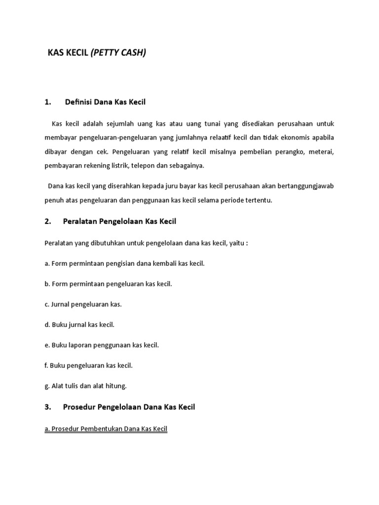 Kas Kecil Docx Pengelolaan Dana Kas Kecil Kas Kecil Adalah Uang Tunai Yang Disediakan Khusus Untuk Pembayaran Yang Jumlahnya Relatif Kecil Atau Course Hero