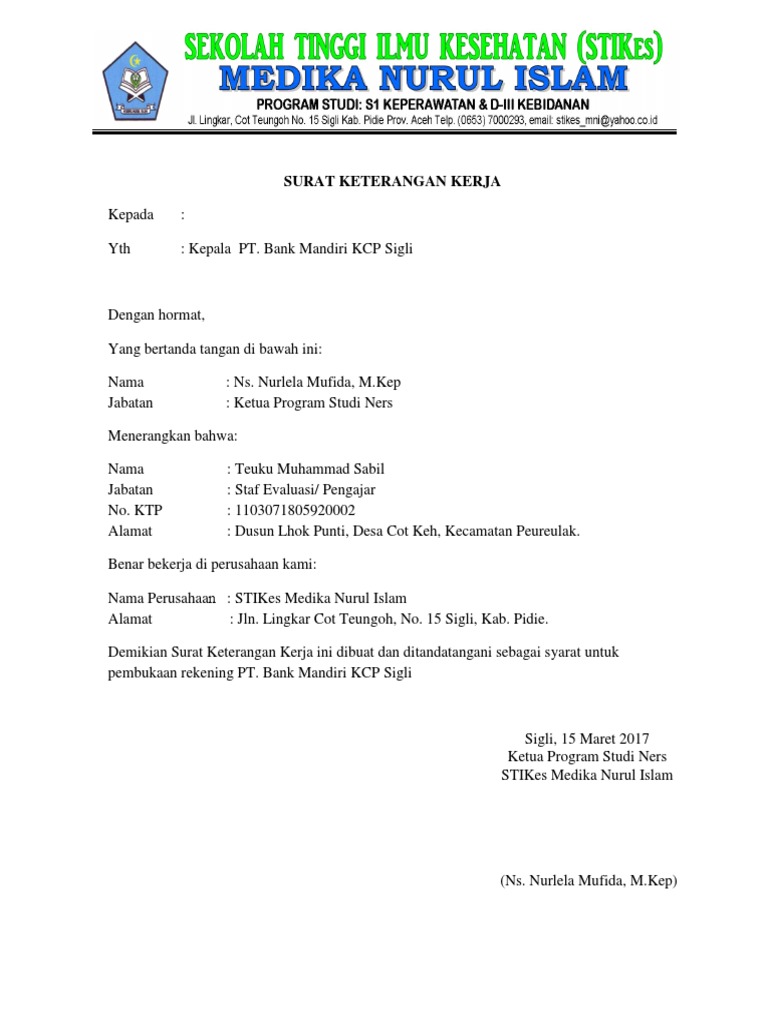 Surat keterangan kerja juga berlaku untuk karyawan kontrak. Untuk memperoleh surat ini, kamu perlu memiliki kelakuan baik dan keluar baik-baik, tanpa Surat keterangan kerja ini juga seringkali dibutuhkan untuk pembuatan kartu kredit, pengajuan pinjaman dana di bank, atau pendaftaran NPWP. Surat keterangan kerja juga disebut sebagai "surat pengalaman kerja (experience letter)" atau dalam KUHP Perdata pasal 1602z disebut dengan surat pernyataan Dengan melihat surat keterangan ini, pihak bank akan lebih mempertimbangkan untuk dikabulkan atau tidaknya permohonan KPR-nya. Apa itu surat keterangan kerja - yakni merupakan surat yang dibuat oleh suatu pihak dengan berdasarkan ketetrangan yang benar atau otentik kepada Sekian surat ini kami buat untuk dokumen pendukung dalam pembuatan rekening Bank BCA cabang Magetan. Magetan, 29 November 2016... 8122020 Contoh Surat Keterangan Kerja untuk pembuatan rekening bank biasanya dibutuhkan jika kita ingin membuat rekening bank sedangkan kita tidak memiliki KTP yang sesuai dengan alamat domisili sebagai lokasi bank tersebut berada.