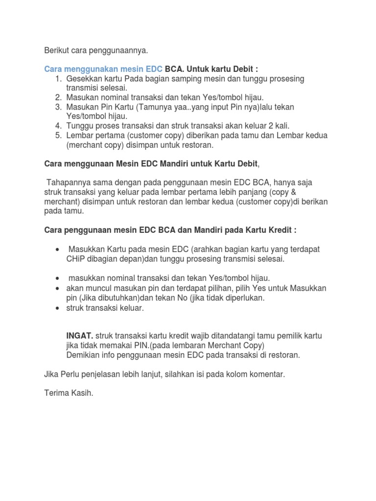 Kali ini saya akan menjelaskan mengenai cara penggunaaan mesin EDC BCA, buat yang masih bingung bisa langsung disimak aja yuk! Untuk penggesekan kartu sebelumnya saya jelasin dulu ya. ada dua macam cara. 1. Kartu BCA digunakan dengan cara swipe/gesek biasanya model kartu seperti dibawah ini ya 2. Kartu BCA dengan barcode didepan dengan cara dimasukan…