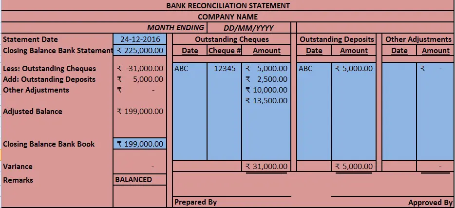Bank Reconciliation Formula - Example #1. From the following particulars, prepare Bank Reconciliation statement for M/s XYZ and company as at 31st December 2018. Balance as per Bank Book is 8,000. Cheques issued of Rs. 20,000 and 25,000 but presented on 5th January 2019.