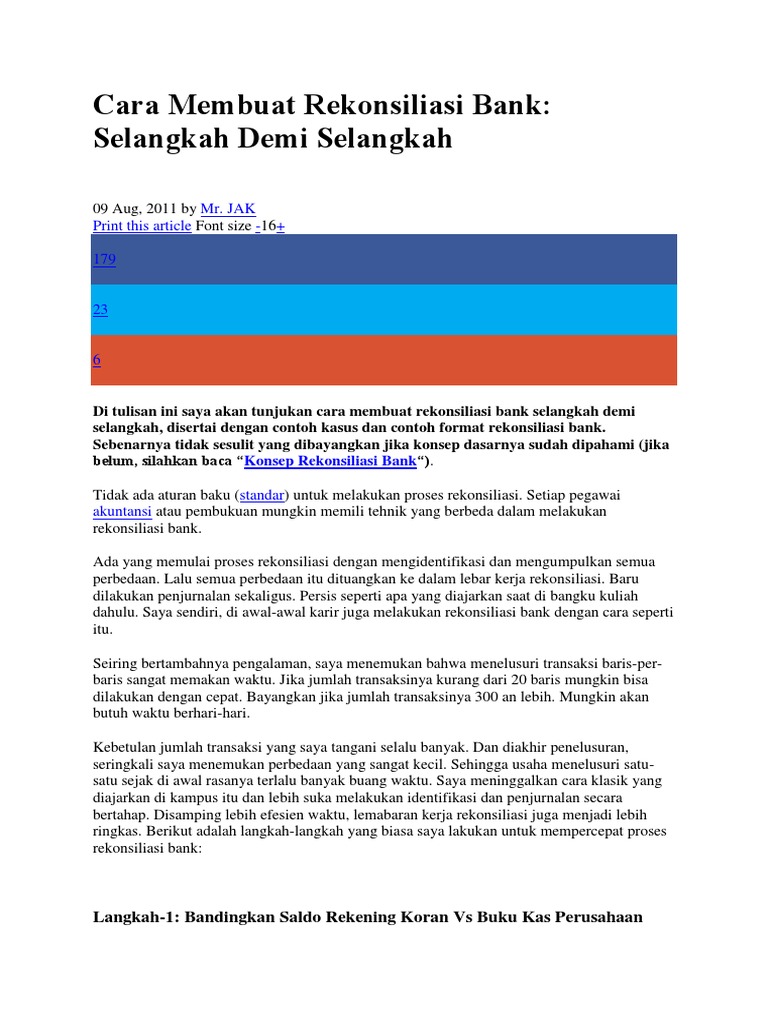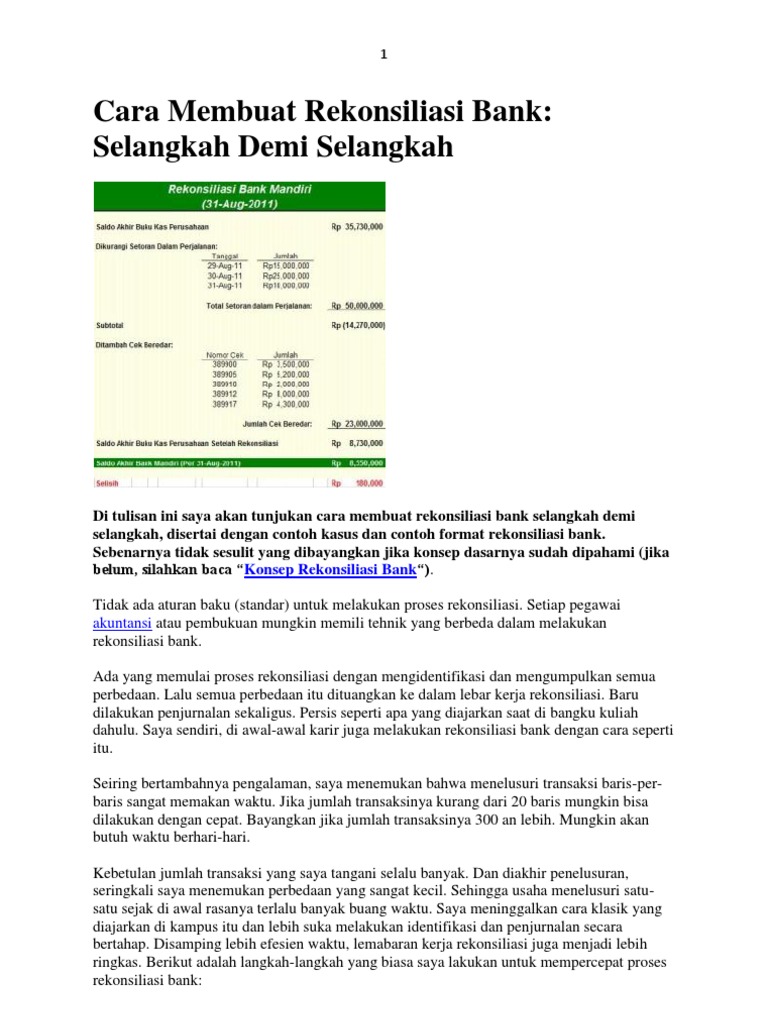 Contoh Soal Rekonsiliasi Bank Untuk Anda. Agar Anda dapat belajar akuntansi dengan mudah, maka berikut ini contoh soal rekonsiliasi bank untuk menyusun dan menyesuaikan laporan rekonsiliasi bank pada pembukuan perusahaan Anda dengan bank. Seperti berikut ini contoh soal rekonsiliasi bank: Saldo kas menurut catatan PT Sukses Kemilau sebesar Rp2 ...