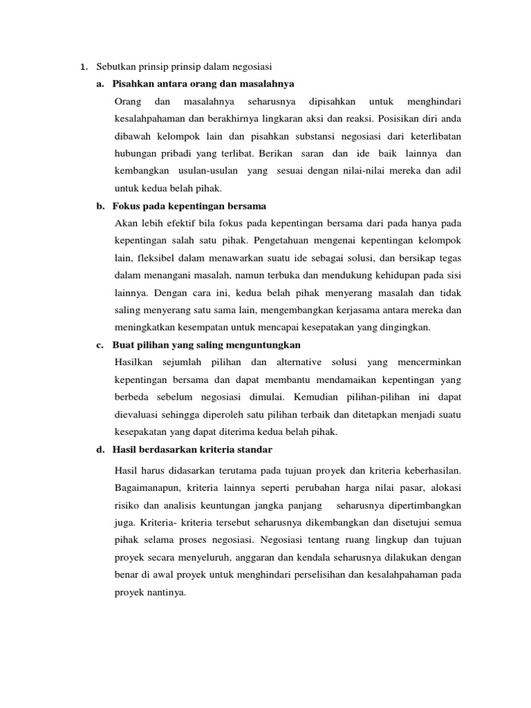 View resume negosiasi ing bisnis.docx from ENGLISH LI SBI6214 at State University of Yogyakarta. Apdariza Alfrida Yumarnis 19808144003 Manajemen E19 ... 21 Pertanyaan Tentang Negosiasi Bisnis. Pelaku lobbying bisa mengembangkan bisnisnya dan mengkomunikasikan maksud dan tujuannya ke pihak yang di lobi. Contoh lain proses negosiasi juga terjadi ketika produsen dan konsumen melakukan tawar menawar harga suatu produk untuk menetapkan harga yang disepakati. Contoh negosiasi destruktif yaitu negosiasi yang terjadi antara para buruh dengan perwakilan ... menegosiasikan berapa besaran kenaikan upah yang akan dibuat. Jan 29, 2021 — Tempat les Training Bahasa Inggris Bisnis di Bandung untuk kelas ... Memberikan pertanyaan dan klarifikasi; Memberikan laporan dalam meeting ...