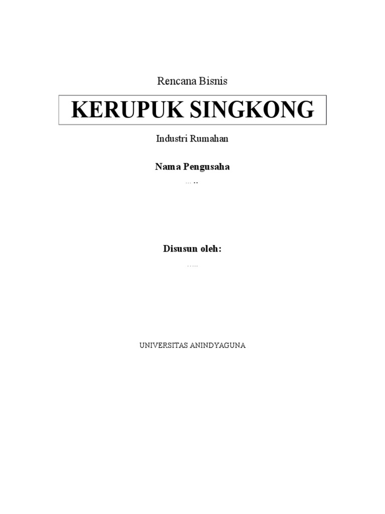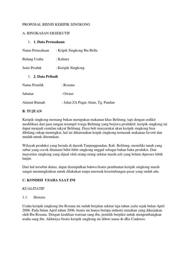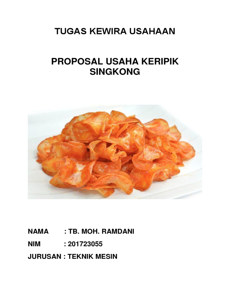 Contoh proposal keripik singkong (kwu) posted by jelajah internet , add comment in contoh proposal on thursday, november 06, 2014 1.2 gagasan usahauntuk mengantisipasi turunnya harga jual produk pertanian (singkong) serta mempertahankan perekonomian industri rumah tangga. Proposal bisnis keripik singkong disusun oleh kelompok 4 dosen pengajar :