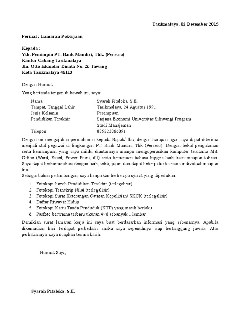 Contoh Surat Lamaran Kerja di Bank Mandiri Format Doc/Docx. Januari 03, 2021 15:13.