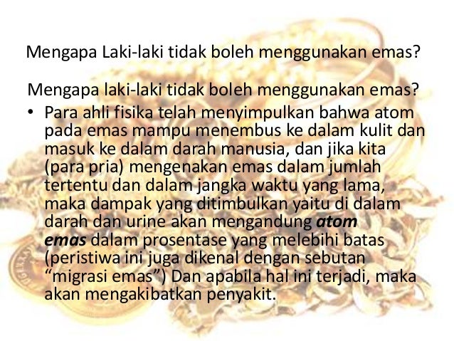 Hukum memakai emas bagi laki laki. Dari dua hadits tersebut, bisa dijelaskan bahwa hukum laki -laki memakai emas dalam Islam adalah haram. Laki -laki hanya diperbolehkan memakai emas jika sangat diperlukan, misalnya untuk keperluan medis seperti menambal hidung dan gigi. Yang demikian pernah terjadi pada masa Rasulullah SAW. A. HUKUM MEMAKAI SUTERA DAN EMAS BAGI LAKI -LAKI 1. Laki -laki memakai sutera Dalam pangdangan islam kaum laki -laki dilarang memakai perhiasan sutera. Karena laki -laki diciptakan lebih kekar kulitnya dari pada wanita yang berkulit halus dan lembut. Kecuali ada kebutuhan yang berhubunagan dengan penyakit kulit maka diberi keringanan (rukshah). Hukum -hukum ini biasanya sifat hubungan yang deduktif. Suatu hukum menunjukkan suatu hubungan antara variabel-variabel empiris yang bersifat ajeg dan dapat diramal sebelumnya 2. Suatu teori juga dapat merupakan suatu rangkuman tertulis mengenai suatu kelompok hukum yang diperoleh secara empiris dalam suatu bidang tertentu. Pengganti Emas Bagi Laki -Laki Menurut Lembaga Fatwa Syabakah Islamiyah, laki -laki diperbolehkan untuk menggunakan emas putih dengan syarat sebagai berikut: “ Apa yang saat ini disebut emas putih, jika itu berupa emas asli maka lelaki tidak boleh memakai nya, karena hukum nya sama dengan emas . Jika unsurnya bukan emas , boleh.