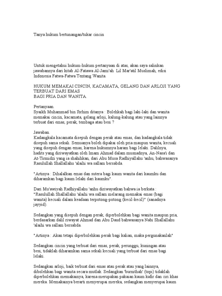 Pendapat Ulama Tentang Hukum Pria Memakai Emas . Berikut ini ada beberapa pendapat dari para tokoh ulama terkait bagaimana hukum islam bagi seorang pria yang menggunakan emas , antara lain: Imam An-Nawawi Rahimahullah. Imam An-Nawawi Rahimahullah mengatakan, “Adapun memakai cincin emas maka ia adalah haram bagi kaum laki -laki menurut Ijma ... Search the world's information, including webpages, images, videos and more. Google has many special features to help you find exactly what you're looking for. Pria atau laki -laki boleh memakai cincin asalkan tidak terbuat dari emas . Sebagi an ulama berpendapat disunnahkan memakai cincin di tangan kiri. Sebagi an yang lain berpendapat disunnahkan memakai n cincin di jari tangan kanan. Namun pendapat yang lebih kuat menyatakan boleh memakai cincin di jari tangan kanan maupun kiri. 358 Mereka Minta Pertimbangan Nabi tentang Hukum Rajam ... 755 Bab 8 Ujian Berat Bagi Kaum Muslimin Setelah Rasulullah Wafat ... (Ibnu Ishak) adalah laki -laki yang suka memuja-muja wanita, lalu sang Amir memerintahkannya untuk menghadirkan Muhammad di hadapannya, ...