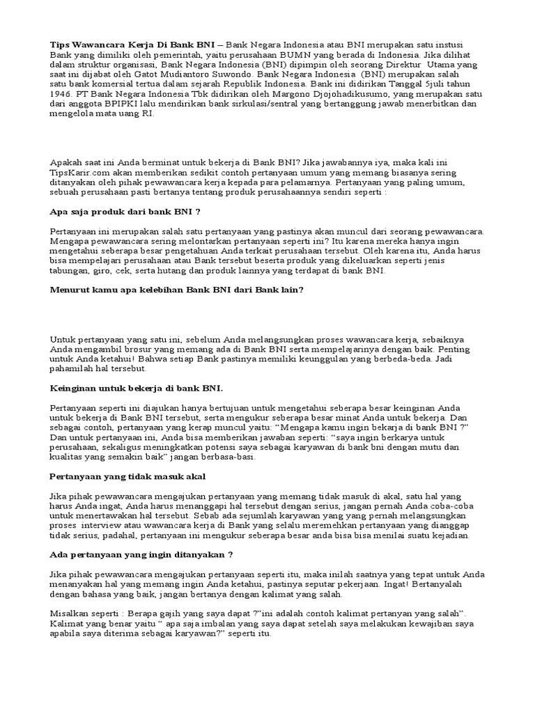 Motivasi bekerja di bank. Sampai sekarang saya masih bekerja di bank, jadi untuk saya pertanyaan ini tidak relevan. Tapi saya ingin berbagi pemikiran salah seorang teman saya yang totally berhenti dari perbankan, padahal sebelumnya dia sudah 10 tahun bekerja di bank dengan posisi sudah lumayan tinggi. Bank BNI merupakan salah satu perusahaan perbankan BUMN di Indonesia dan bekerja di bank BNI merupakan impian bagi kebanyakan orang yang hendak berkarir di bidang perbankan. Selain contoh pertanyaan interview bank BNI, sebelumnya telah dibahas juga pertanyaan interview bank BCA yang dapat kamu pelajari dalam menghadapi interview kerja di bank BCA. Alasan Melamar Pekerjaan di BUMN. Pada dasarnya, alasan ingin bekerja di BUMN tak jauh dari beberapa hal berikut ini: Ingin mencari tantangan baru. Tempat kerja yang nyaman. Gaji yang ditawarkan cukup besar. Merasa bangga bekerja di BUMN karena saingan pendaftarnya banyak dan bergengsi. 1. Peluang Karir. Bank Syariah merupakan bank yang sedang berkembang, tentu akan terus membuka kantor cabang baru di seluruh pelosok Indonesia, ini merupakan alasan yang membuat rekan kerja ku memilih bekerja di Bank Syariah. 2. Kesejahteraan Terjamin. Perbankan syariah sangat konsen dalam memperhatikan kesejahteraan pegawainya, mulai ...
