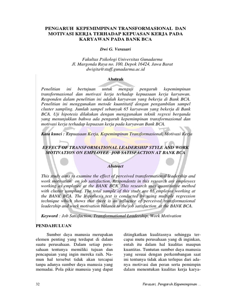 GAYA KEPEMIMPINAN DAN MOTIVASI KERJA KARYAWAN DI BANK SYARIAH MANDIRI KANTOR CABANG PEMBANTU MAJENANG Annisa Octaviani NIM. 1323206014 E-mail:Annisaoctaviani04@gmail.com Program D III Manajemen Perbankan Syariah ... agar dapat bekerja dengan baik dan benar. Kepemimpinan adalah kemampuan