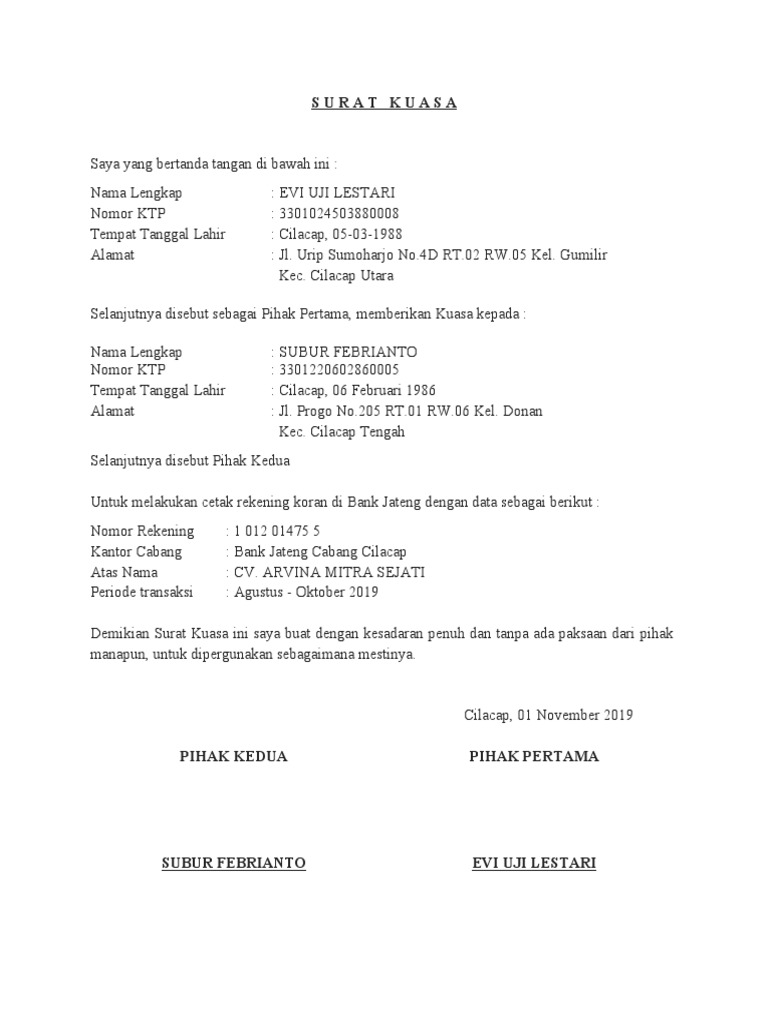 Bengkulu, sinarnusantaranews.com - Salah satu dukungan masyarakat terhadap pembangunan di suatu daer June 23, 2015 - SURAT KUASA Yang bertanda tangan dibawah ini saya : Nama STATUS ALAMAT : FADELAN : SUAMI : Jl. Jaksa Agung Suprapto No. 223 Bangil sebagai PEMILIK REKENING BANK MANDIRI,… Bank Mandiri sebagai salah satu bank BUMN terbesar menawarkan program KPR dengan cicilan terjangkau untuk kamu yang ingin memiliki rumah di kawasan Jakarta Timur. ... 7 Contoh Surat Kuasa Pengambilan Uang di Bank Beserta Struktur Pembuatannya. Selasa, 25/01/2022 20:00. 30 Kata Kata Aesthetic Terbaik, yang Bikin Media Sosial Kamu Tambah Keren ...