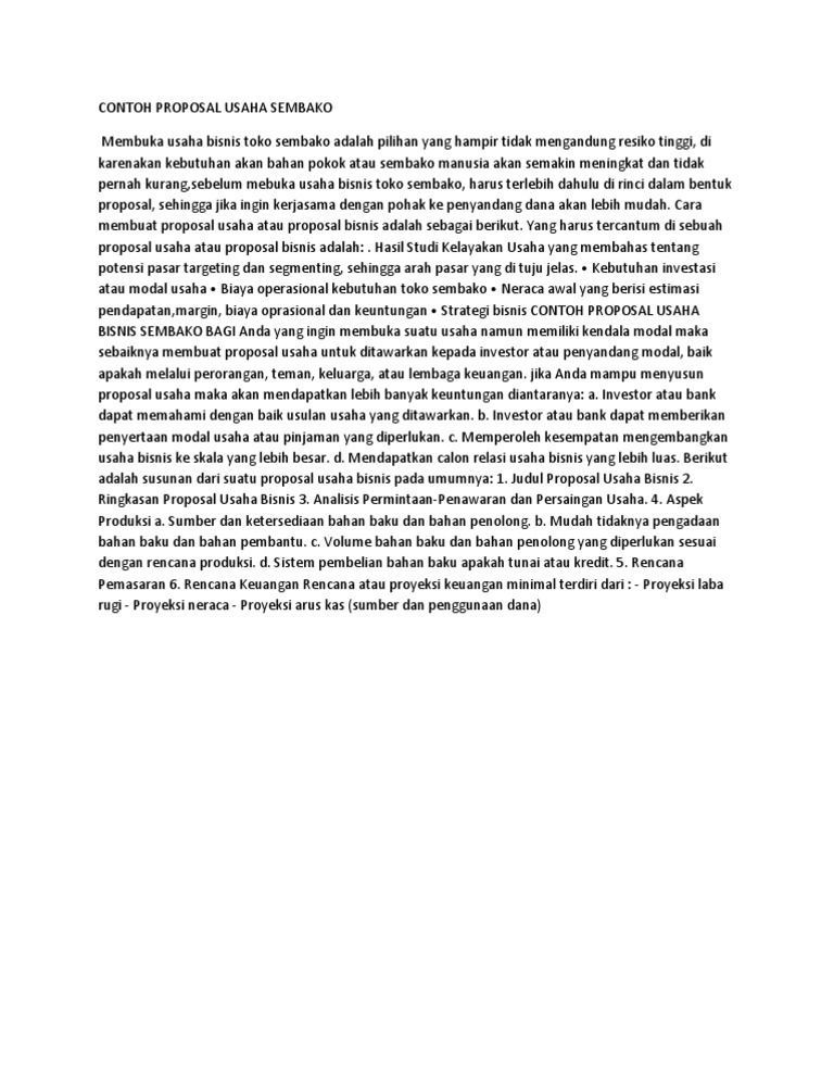 Contoh proposal bisnis pdf. 7 Aug 2019 — PDF | Salah satu ide bisnis kreatif yang menggiurkan adalah bisnis ... contoh, beberapa produsen percaya bahwa jika mereka dapat membuat ... Contoh Proposal Usaha Bisnis Cafe. BAB II DESKRIPSI ASPEK – ASPEK USAHA A. Deskripsi Umum Usaha Untuk melayani kebutuhan manusia yang tak lepas dari rutinitas yang harus dilakukan yaitu makan karena dengan makan bias mengembalikan energi kita. Denagan aneka makanan dan minuman yang enak dan segar dengan harga yang bias dicapai oleh semua ... Judul Contoh Proposal. Judul : proposal pendirian bisnis percetakan dengan menggunakan digital printing. BAB I PENDAHULUAN 1. Latar Belakang. Teknologi yang semakin canggih ini memberikan inovasi modern bagi perusahaan, perkantoran dan usaha lainya. 19 Sept 2021 — Seperti pengetahuan usaha dan sosial, tehnik dan cara membuat proposal business rencana sebenarnya tidak memiliki sifat kaku dan saklek.