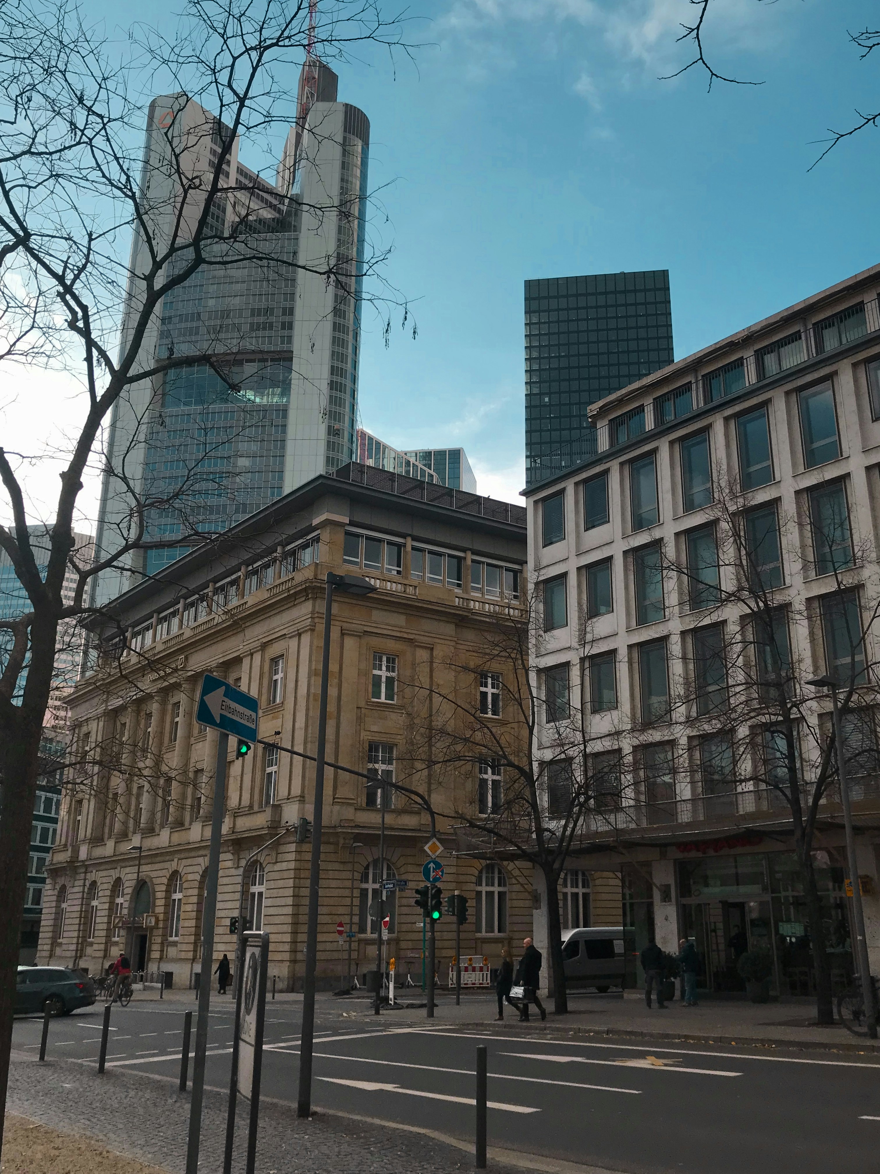 Modern office bank building skyscraper. Urban architecture storefront â finance district Frankfurt am Main