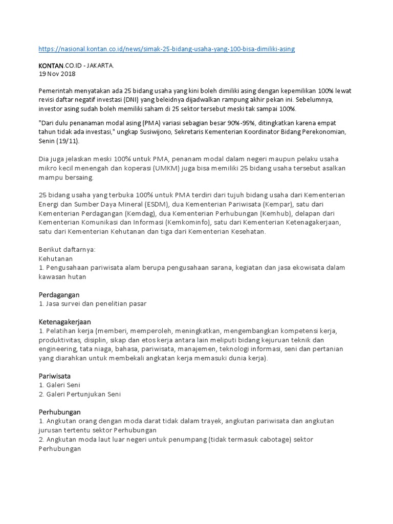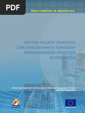 Daftar negatif investasi pdf. Dni ini merupakan salah satu produk hukum yang diciptakan untuk membuat para investor memiliki kejelasan pilihan bidang usaha yang ada di negara kita. Pasal 4 ayat 1 undang undang dasar negara republik indonesia tahun 1945. Daftar negatif investasi di indonesia. Negative List (also known as Daftar Negatif Investasi) specifying business activities which are either entirely closed or conditionally open to foreign investment. This follows a year of comprehensive discussions at parliamentary level and revises the previous 2010 Negative List. The enactment of the new Negative List was one