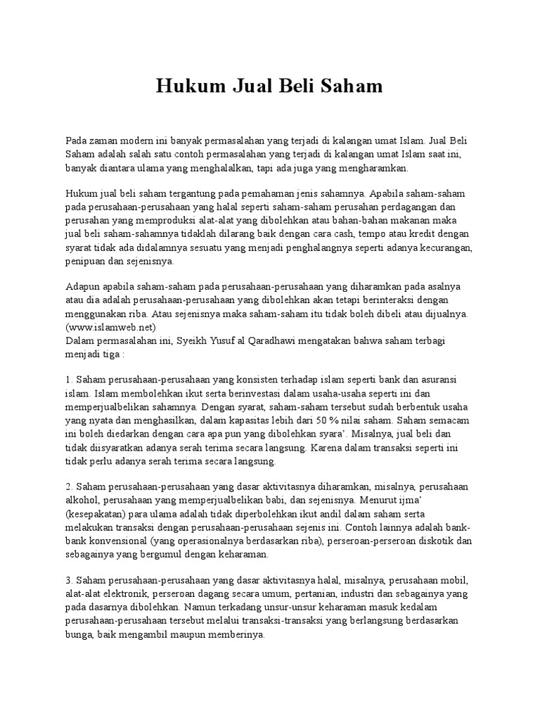 Hukum saham dalam islam. Hukum Halal Jual Beli Saham. Ulama Fiqih kontemporer mengemukakan pendapat yang sama jika hukum memperdagangkan saham di pasar modal merupakan kegiatan yang haram apabila berasal dari perusahaan yang bergerak di bidang yang diharamkan dalam Islam dan akan lebih baik jika melaksanakan cara berdagang Rasulullah.Saat mengikuti kegiatan jual beli saham pada perusahaan yang bergerak di bidang haram ... Karena hukum dasar dalam perniagaan adalam halal dan mubah, maka mendirikan suatu perusahaan publik yang bertujuan dan bergerak dalam hal yang mubah adalah dibolehkan menurut syariat. Tidak diperselisihkan akan keharaman ikut serta menanam saham pada perusahaan-perusahaan yang tujuan utamanya diharamkan, misalnya bergerak dalam transaksi riba ... Hukum Trading Saham dalam Islam. Hukum trading saham menurut islam. Meski begitu tak jarang masyarakat awam bertanya-tanya mengenai hukum trading saham dalam Islam. Ada yang mengatakan bahwa disebut sebagai bursa karena. Setidaknya OJK Otoritas Jasa Keuangan menggariskan ada 7 produk yang bisa diperdagangkan. Hukum Saham Dalam Islam. Secara umum, hukum beli saham menurut Islam adalah halal jika dilakukan sesuai dengan transaksi syariah, terutama jika saham dibeli dengan pasti, bebas dari hal-hal yang mencengangkan, dan tidak mengandung unsur riba dalam pembeliannya. Saham-saham yang diizinkan adalah saham perusahaan dagang atau perusahaan manufaktur ...