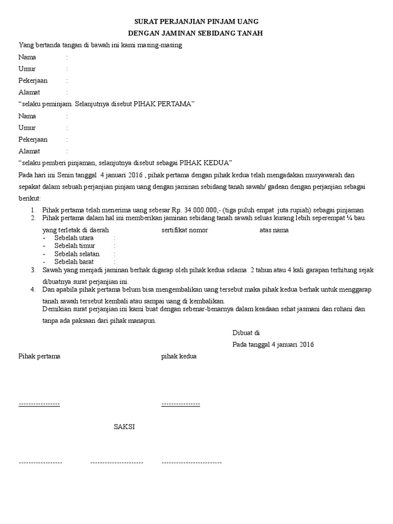 Itulah contoh surat perjanjian pinjam uang tanpa jaminan yang tidak meminta jaminan sebagai isyarat peminjaman. Namun meskipun begitu pihak penerima pinjaman harus tetap serius dalam melunasi pinjaman yang diberikan sebab apabila dalam jangka waktu yang telah ditentukan pihak penerima pinjaman tidak mampu melunasi pinjamannya maka pihak pemberi ... Sebuah utang koleksi Surat Perjanjian Hutang dikenal sebagai Surat perjanjian dengan sebuah barang dengan jaminan. Jaminan untuk hutang menjadikan tekanan pada si peminjam untuk melunasi tagihan dengan jangka waktu yang di tentukan, dalam waktu tertentu yang ditentukan, dan menerangkan tentang jumlah total utang yang di pinjam. Surat Perjanjian September 29, 2021 18:54. Contoh Surat Perjanjian Hutang Piutang - Persoalan utang-piutang bukanlah hal yang asing dalam kehidupan kita sehari-hari. Banyak orang yang terpaksa melakukan proses hutang demi memenuhi kebutuhan hidup mereka. Hutang tersebut dapat diperoleh dari perseorangan maupun dari pihak instansi seperti bank.