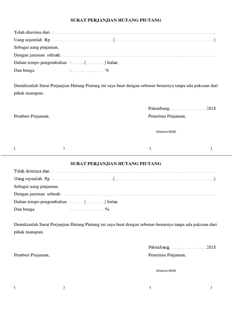 Surat Perjanjian September 29, 2021 18:54. Contoh Surat Perjanjian Hutang Piutang - Persoalan utang-piutang bukanlah hal yang asing dalam kehidupan kita sehari-hari. Banyak orang yang terpaksa melakukan proses hutang demi memenuhi kebutuhan hidup mereka. Hutang tersebut dapat diperoleh dari perseorangan maupun dari pihak instansi seperti bank.