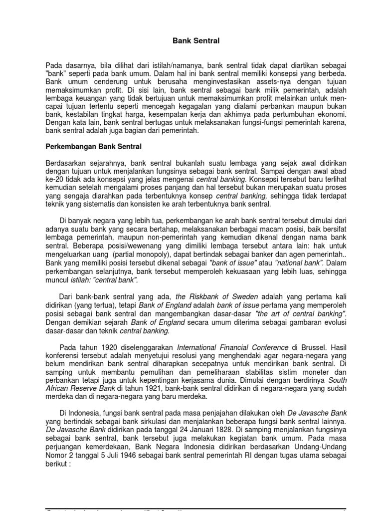 Jan 29, 2020 — Bank Umum: Fungsi, Peran, dan Jenisnya · Menghimpun dana dari masyarakat · Menyalurkan dana kepada masyarakat · Menyediakan layanan jasa bank. memantapkan fungsi bahasa Indonesia sebagai bahasa negara. Jakarta, Maret 2016 Prof. Dr. Dadang Sunendar, M.Hum. Pedoman Umum Ejaan Bahasa Indonesia iv PERATURAN... (2) Pedoman Umum Ejaan Bahasa Indonesia sebagaimana dimaksud pada ayat (1) tercantum dalam Lampiran yang merupakan bagian tidak terpisahkan dari Peraturan Menteri... Bank sentral merupakan lembaga yang ditujukan untuk kebijakan publik dan bukan dari kepentingan individu. Fungsi bank sentral sendiri adalah sebagai lembaga yang menerbitkan uang, perumus kebijakan moneter, penyedia jasa perbankan, dan lain sebagainya. Sebagai contoh, peran bank sentral di Indonesia telah dijalankan oleh Bank Indonesia.