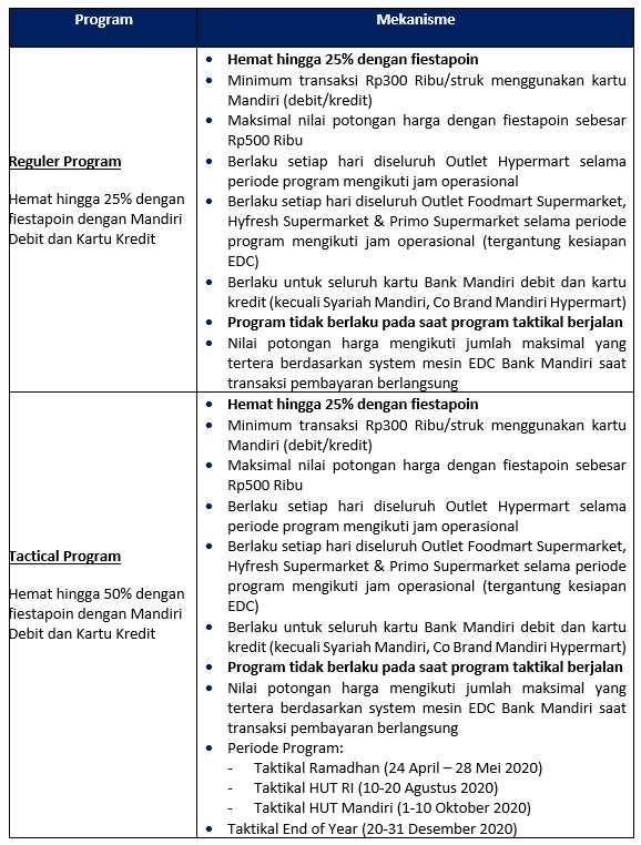 Explore tweets of mandiri kartu kredit @mandiricard on Twitter. Bank Mandiri adalah peserta penjaminan LPS yg terdaftar & diawasi oleh Otoritas Jasa Keuangan. Promo berlaku di AEON BSD, Jakarta Garden City, dan Sentul City hingga 31 Januari 2022. Promo Regular. Hemat hingga 25% dengan Livin'poin; Minimum transaksi Rp500 Ribu/struk menggunakan kartu Mandiri (debit/kredit) Maksimal nilai potongan harga dengan Livin'poin sebesar Rp500 Ribu; Berlaku setiap hari diseluruh Outlet Hypermart selama periode program mengikuti jam operasional