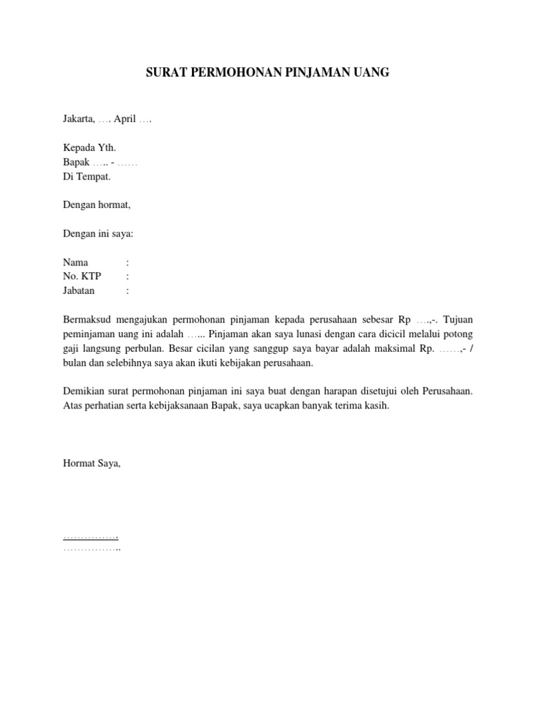 Surat Rasmi Memohon Pinjaman Wang Contoh surat rasmi memohon cuti. Bagi yang ingin memohon pinjaman tekun nasional haruslah melengkapkan borang permohonan pinjaman tekun dan diserahkan kembali kepada pejabat tekun nasional yang berhampiran dengan tempat tinggal. Telipot, jln long yunus, 15200 kota bharu, kelantan.