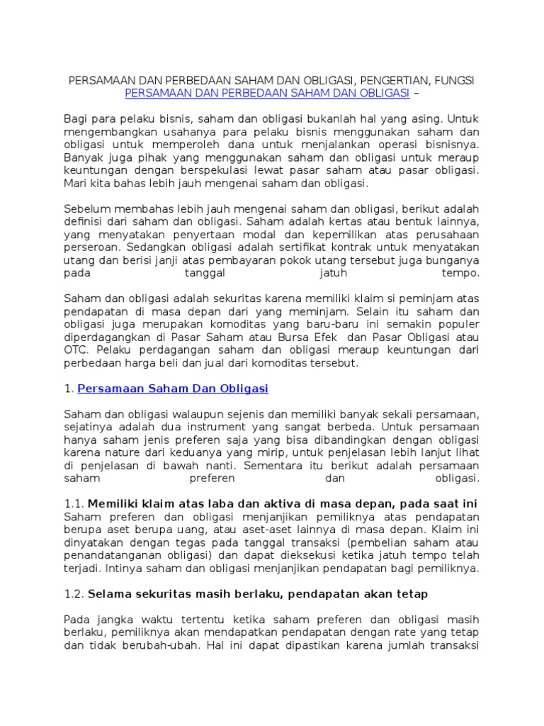 perbedaan saham dan obligasi Walaupun untuk sebagian kecil orang saham dan obligasi sudah tidak asing lagi, kami akan menyuguhkan pengetahuan ini untuk para pemula, para pelajar/mahasiswa barangkali bisa dijadikan contekan waktu ujian atau sebagai ancang-ancang sebagai investor.