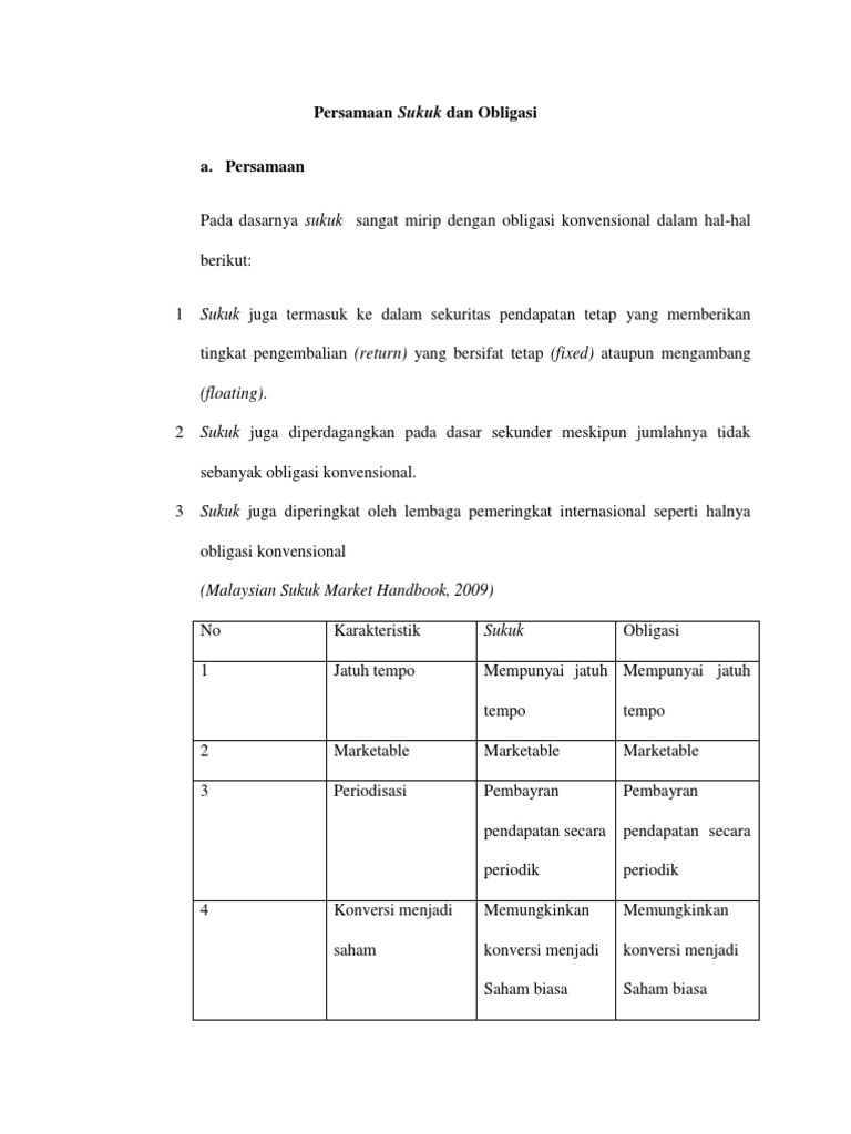 Apa perbedaan Sukuk, Obligasi Konvensional dan Saham? Prinsip Dasar Sukuk : Bukan merupakan surat utang, melainkan kepemilikan bersama atas suatu aset/proyek Saham : Surat pernyataan utang dari issuer Obligasi: Kepemilikan saham dalam perusahaan Klaim Sukuk : Klaim kepemilikan didasarkan pada aset/proyek yang spesifik Saham : Emiten menyatakan sebagai pihak peminjam Obligasi: Menyatakan ...