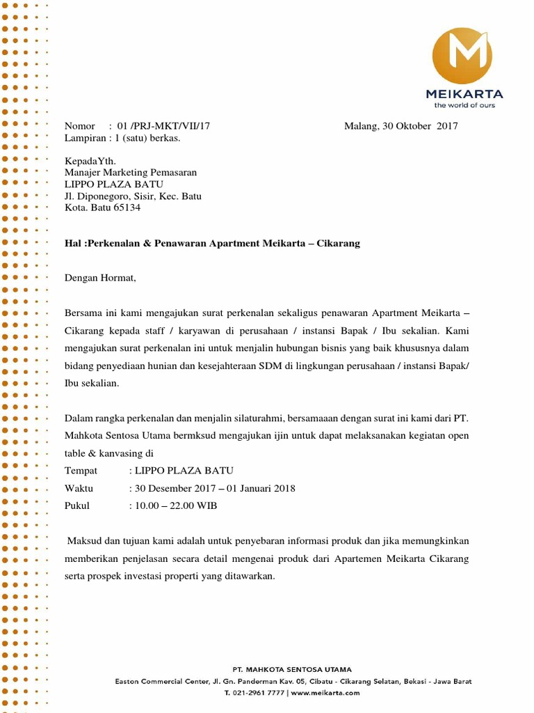 43 contoh surat penawaran kerjasama investasi - Info ... Contoh Surat Penawaran Investasi | PDF - Scribd Nomor Surat : Lampiran: Skema Investasi & Company Profile Perihal: Penawaran Investasi. Kepada Yth. Bpk. Ayub Idrus Di Tempat Assalamualaikum Wr. Wb. Dengan hormat, PT Bangun Persada Semesta merupakan salah satu perusahaan pengembang sektor properti sejak tahun 2009.