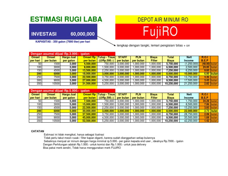 Perhitungan bisnis air isi ulang. 0852-79797-384 | perhitungan bisnis air isi ulang... - Pastelink.net INVESTASI ATAU MODAL BISNIS AIR MINUM ISI ULANG beberapa tips di atas saat sebelum melakukan, ada baiknya Anda melakukan perhitungan nilai investasi modal dan keuntungannya pada bisnis yang dapat ditempuh. Peluang Usaha Bisnis Air Isi Ulang Panduan Lengkap Analisa Modal... Bisnis air isi ulang biasa (Air Mineral). Air minum yang dijual biasanya tanpa merk atau merk sendiri namun belum terkenal (skalanya masih kabupaten atau 5 Alasan Peluang Usaha Air Isi Ulang Makin Prospektif. Bisnis air isi ulang akan selalu hidup. Ada beberapa penyebab kenapa bisnis ini punya... abesu.org/bisnis-air-mineral Keuntungan bisnis air minum isi ulangПодробнее. Bisnis Franchise Air Minum Isi Ulang Yang Terbaik 2021Подробнее. #3 Perhitungan Bisnis Air Amanah (Galon dan Botol)Подробнее. Perincian Modal Usaha Air Isi Ulang Sesuai... | The Cronut Project Perhitungan bisnis air isi ulang ini bervariasi tergantung jenis teknologi yang digunakan serta tempat yang anda miliki. Pada artikel ini, kami hanya akan membahas mengenai modal usaha air minum isi ulang dari alat (teknologi pengisian) serta biaya operasional bulanan yang akan anda butuhkan.