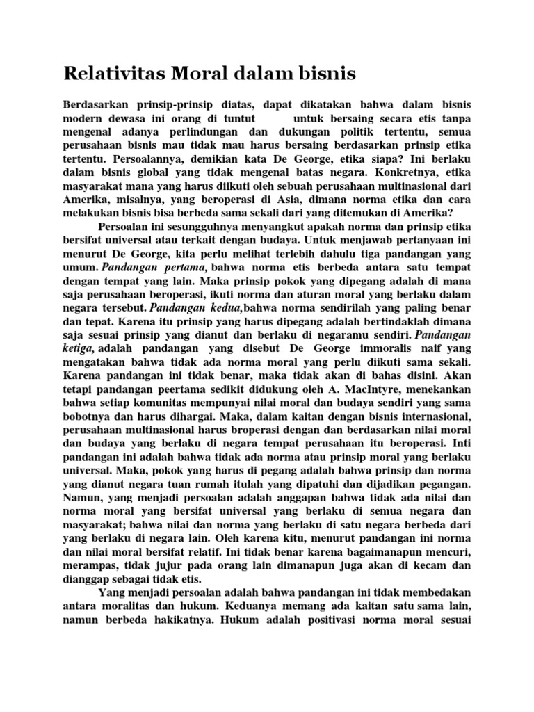 Relativitas Moral Dalam Bisnis - DOKUMEN.TIPS Relativitas Moral Dalam Bisnis. Menurut De George, ada tiga pandangan umum yang dianut : 1. Pandangan pertamaadalah norma etis berbeda antara satu tempat ...