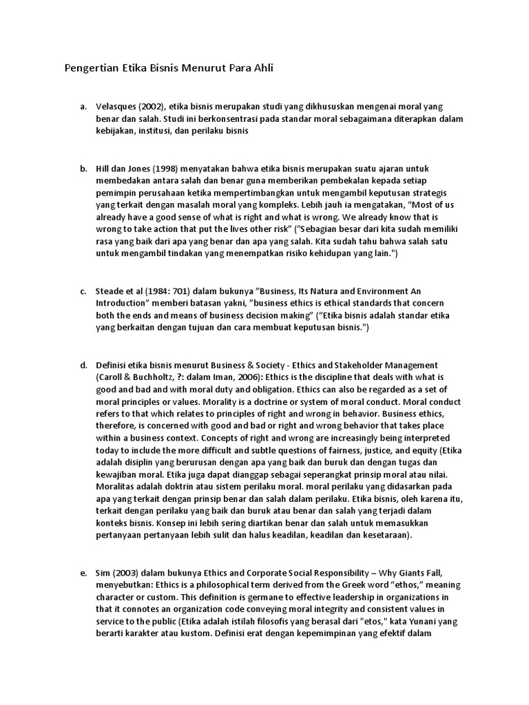 Etika Bisnis: Pengertian Menurut Ahli, Tujuan Serta Contohnya Pengertian Etika Bisnis Menurut Para Ahli. Berikut ini beberapa definisi etika bisnis menurut beberapa ahli. 1. Velasgues. Adalah studi yang dikhususkan tentang moral yang benar dan salah, dimana studi ini berkonsentrasi pada standar moral yang sudah diterapkan dalam kebijakan, institusi serta perilaku bisnis ...