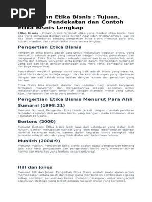 Mengenal Pengertian Etika Bisnis, Teori, Prinsip, dan Contoh Pengertian Teori Etika Bisnis Menurut para Ahli Sebagai referensi tambahan, berikut sejumlah definisi teori etika bisnis menurut para ahli yang bisa Anda pelajari. Yosephus , etika berbisnis adalah penerapan moral dalam bidang ekonomi, utamanya industri bisnis. Etika - Pengertian, Perkembangan, Prinsip, Tujuan, dan ... Berikut ini ada beberapa pengertian bisnis menurut para ahli : Allan afuah (2004) Bisnis adalah suatu kegiatan usaha individu yang terorganisasi untuk menghasilkan dana menjual barang ataupun jasa agar mendapatkan keuntungan dalam pemenuhan kebutuhan masyarakat dan ada di dalam industry. T. chwee (1990) Etika Bisnis Islam: Pengertian, Prinsip dan Tujuan - Buku ... Baca artikel terkait: Pengertian Etika Bisnis. Pengertian Etika Bisnis Islam Menurut Para Ahli. Setelah diatas memahami tentang pengertian etika dan bisnis islam menurut para sumber dan ahli, kali ini kita akan membahas tentang, pendapat para ahli islam tentang apa sih "Etika Bisnis Islam itu?". Berikut penjelasan lengkapnnya. 1. Prof. Dr. H. Pengertian Etika Profesi dan Etika Bisnis Menurut Para Ahli Definisi etika bisnis adalah sebagai nilai moral yang bisa dibedakan mana yang benar dan salah kemudian diterapkan pada kegiatan bisnis. • Menurut Valeasques etika bisnis adalah studi yang tujukan hanya untuk membahas moral yang benar dan salah. Studi ini hanya lebih spesifik kepada kebijakan yang diterapkan, institusi dan perilaku bisnis.