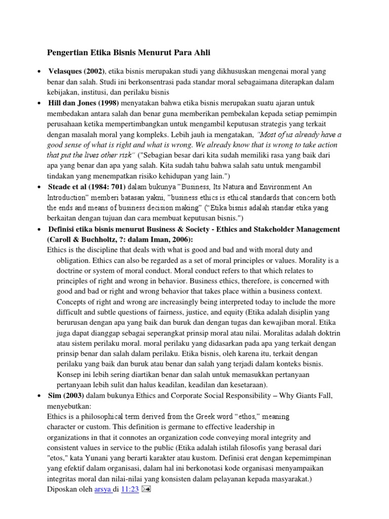 Manajemen: Pengertian Etika Bisnis Menurut Para Ahli Pengertian Etika Bisnis Menurut Para Ahli. · Velasques (2002), etika bisnis merupakan studi yang dikhususkan mengenai moral yang benar dan salah. Studi ini berkonsentrasi pada standar moral sebagaimana diterapkan dalam kebijakan, institusi, dan perilaku bisnis. · Hill dan Jones (1998) menyatakan bahwa etika bisnis merupakan suatu ajaran untuk ...