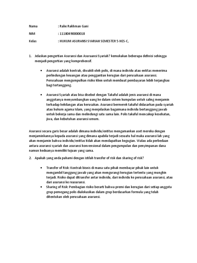 Hukum Asuransi di Indonesia: Ketentuan, Tujuan, dan Jenis Dec 24, 2021 · Apa Itu Hukum Asuransi? Menurut Ketentuan Pasal 246 KUHD, asuransi adalah perjanjian yang mengikat penanggung dan tertanggung. Pihak penanggung akan menerima premi untuk nantinya dibayarkan kepada tertanggung sebagai bentuk penggantian karena kerugian, kerusakan atau kehilangan keuntungan akibat dari suatu peristiwa tidak pasti. Bolehkah Double Claim Asuransi? - Klinik Hukumonline Saya bekerja di sebuah rumah sakit, kadang menjumpai ada seorang pasien yang memiliki asuransi lebih dari satu (3 atau bahkan 7 asuransi). Yang menjadi masalah ketika terdapat satu pasien dalam satu perawatan akan melakukan klaim asuransi di semua asuransi yang diikutinya, karena setiap asuransi pasti memiliki prosedur sendiri-sendiri dalam proses klaim sehingga terkadang seorang dokter harus ... Gaji Hasil Bekerja di Perusahaan Asuransi Syariah, Apakah ... Hukum Bekerja di Perusahaan Asuransi Syariah. Saudaraku sekalian yang mencintai Sunnah dan dicintai oleh Alloh, hukum asal asuransi adalah haram sekalipun itu berbaju Syariah, sebab secara system masih tidak akan lepas dari beberapa hal berikut ini : Memakan harta dengan Bathil Tidak bisa dipungkiri, walaupun banyak Instansi asuransi yang juga sedang kolaps/hancur/bangkrut tetapi secara umum ...
