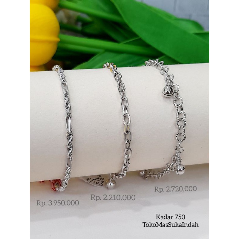 Ingin Gelang Untuk Tampil Elegan? Ini Dia 9+ Model Gelang ... Gelang Emas Model Rantai Plat Variasi Putih Gelang ini disebut memiliki kadar emas 42%. Panjangnya mencapai 17 cm dengan berat 3,85 gram. Bisa digunakan untuk menemani aktivitas sehari-hari maupun dibawa ke acara formal. Gelang ini dijual di Bukalapak dengan harga Rp 1.078.000.