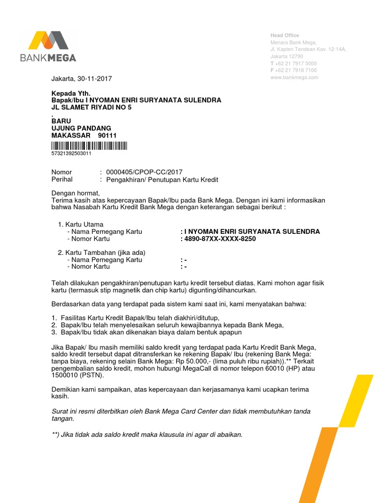 Catatan Apapun Ada: Cara Menutup Kartu Kredit Bank MEGA ... Pada 7 Maret 2017 14.30 saya Telepon ke Bank Mega di 1500010 menghubungi customer service bagian penutupan kartu kredit, dilakukan verifikasi utk membuka data kita, saya utarakan maksud dan tujuan saya menutup kartu kredit ditanya alasannya, dalam hal ini alasan saya m enutup kartu kredit karena memang ingin mengurangi pengguna an kartu kred it selai n alasan karena biaya tahunan yg selalu ...