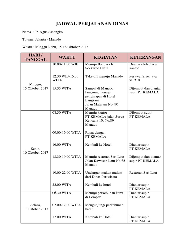 Contoh jadwal perjalanan dinas pimpinan Minggu, 12 Mei 2013. Contoh jadwal perjalanan dinas pimpinan. Pt arga papan sejahtera. Jalan Urip Sumoharjo 12-15, Jakarta. Jadwal kegiatan perjalanan bisnis. Bapak piter laba, s.e., M. sc., direktur pt arga papan sejahtera.