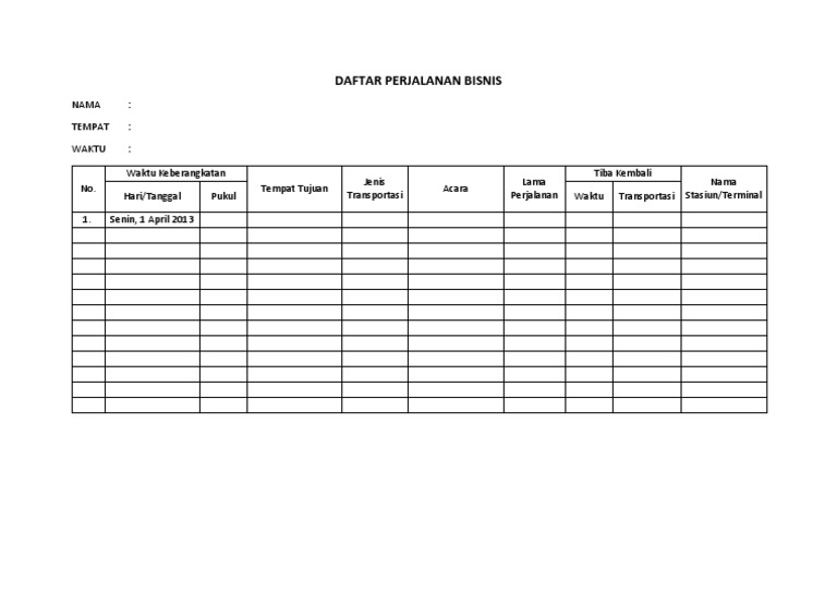 Contoh Tabel Daftar Perjalanan Bisnis ini adalah tabel daftar perjalanan bisnis by nur3aini-13. Download now. SaveSave Contoh Tabel Daftar Perjalanan Bisnis For Later. 0 ratings0% found this document useful (0 votes).