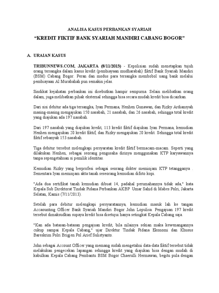 Contoh Kasus Bank Syariah Di Indonesia Contoh Kasus Penyimpangan Transaksi Pada Bank Syariah Terhadap Koperasi Berkah Syariah. Studi kasus pada bank Syariah di Indonesia yang dimana pada saat auditor sedang mengaudit laporan keuangan bank Syariah tersebut yang merupakan cabang dari bank konvensional auditor...