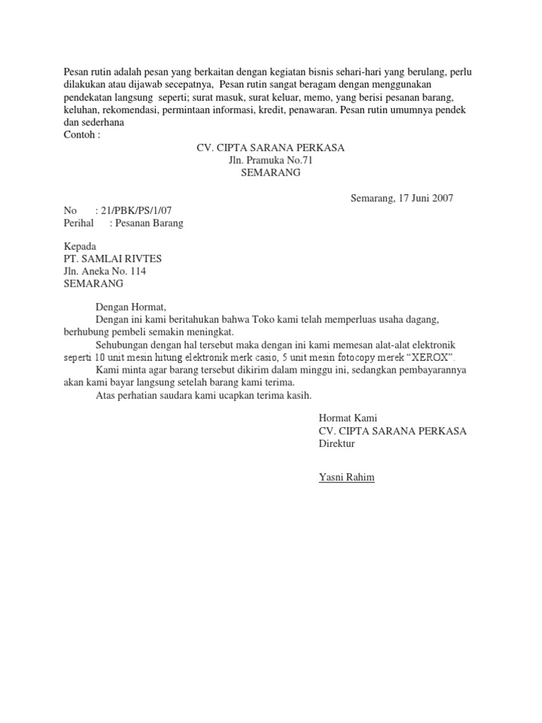 30 Contoh Pesan Rutin Dalam Komunikasi Bisnis - Info Uang ... Aug 10, 2018 · Contoh pesan bisnis dalam komunikasi bisnis yang pertama adalah melalui surat. Strategi untuk menulis permintaan rutin. Contoh dari pesan permintaan langsung ini dat terlihat pada pembuatan surat pesanan permintaan rutin aduan atau klaim permintaan kredit rutin. Oleh sebab itu pesan sponsor juga termasuk didalamnya.