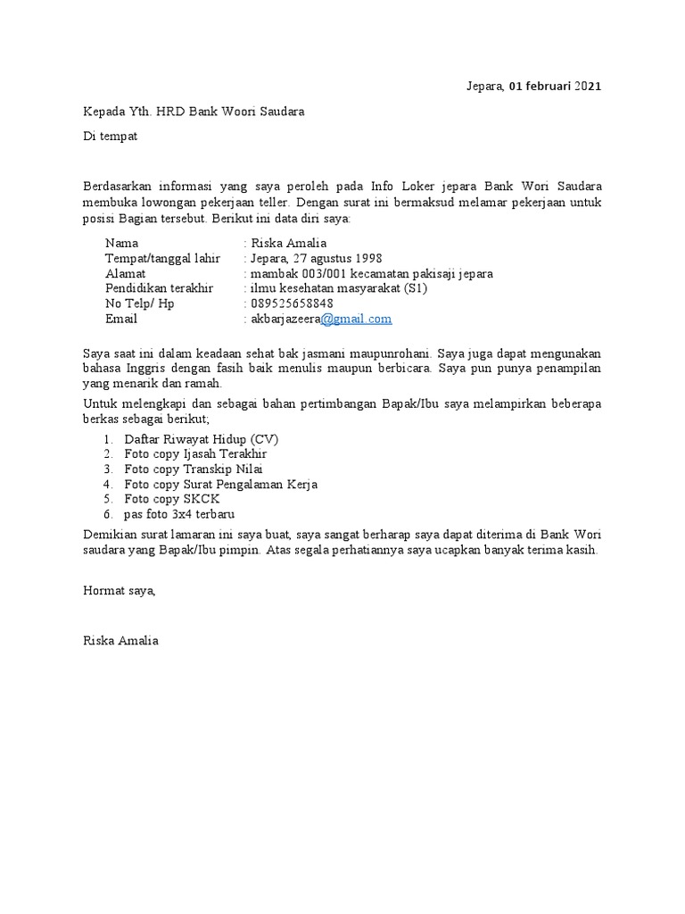 Contoh surat lamaran ke bank. 10+ Contoh surat lamaran kerja bank mandiri - Contoh Surat Contoh surat lamaran kerja Bank Mandiri Bekerja di bank adalah merupakan impian semua orang, apalagi bank Mandiri adalah salah satu bank BUMN di indonesia. Karena bank terkenal dengan kesejahteraan karyawannya yang bagus. Banyak orang berlomba lomba untuk melamar pekerjaan di bank, baik itu yang mempunyai ijazah sarjana, D3 ataupun SMU. blog.danain.co.id › contoh-surat-tembusan-dan-tataIni Dia, Contoh Surat Tembusan dan Tata Cara Membuatnya! - Blog Nov 12, 2021 · Dicantumkan apabila surat tersebut dikirim ke pihak lain selain penerima surat. Tembusan biasanya ditulis pada bagian bawah kiri surat. CONTOH SURAT TEMBUSAN DAN CARA MEMBUATNYA. Perlu diketahui, contoh surat tembusan ada beberapa jenis, yakni tembusan yang obyeknya hanya satu, tembusan yang obyeknya lebih dari satu, dan tembusan buta. 20 Contoh Surat Lamaran Kerja di Bank 2022 - Pilihprofesi Contoh Surat Lamaran Kerja di Bank - Bekerja menjadi salah satu pegawai atau karyawan di bank di Indonesia tentunya jadi dambaan bagi setiap orang, tidak terkecuali Anda. Karena bisa dikatakan menjadi pegawai bank memiliki GAJI yang cukup tinggi.. Tidak hanya memiliki gaji tinggi, tentunya menjadi pegawai bank juga dikenal memiliki image yang cukup bagus. 15+ Contoh Surat Lamaran Kerja di Bank yang Baik dan Benar ... Melamar kerja di bank merupakan sebuah peluang karir yang menjanjikan, terutama bagi Kamu yang memang kuliah di jurusan yang berkaitan dengan keuangan atau perbankan. Namun tentu saja, untuk bisa melamar kerja di bank ini tidaklah mudah. Kamu bisa mencari referensi bagaimana contoh surat lamaran kerja yang baik dan benar sebagai persiapan awal.