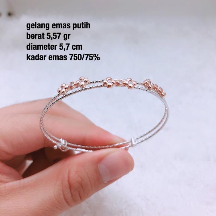 Gelang Emas Putih - Harga Terbaru Maret 2022 | Blibli Review & Daftar Harga Gelang Emas Putih Terbaru 2022. Gelang Emas Putih. Penjelasan Gelang Emas Putih Gelang emas putih adalah perhiasan berupa gelang yang terbuat dari material emas putih. Gelang ini bermacam-macam desainnya. Selain itu, berat dan kadarnya juga bervariasi. Gelang berbahan emas putih terlihat anggun serta cantik saat dikenakan.