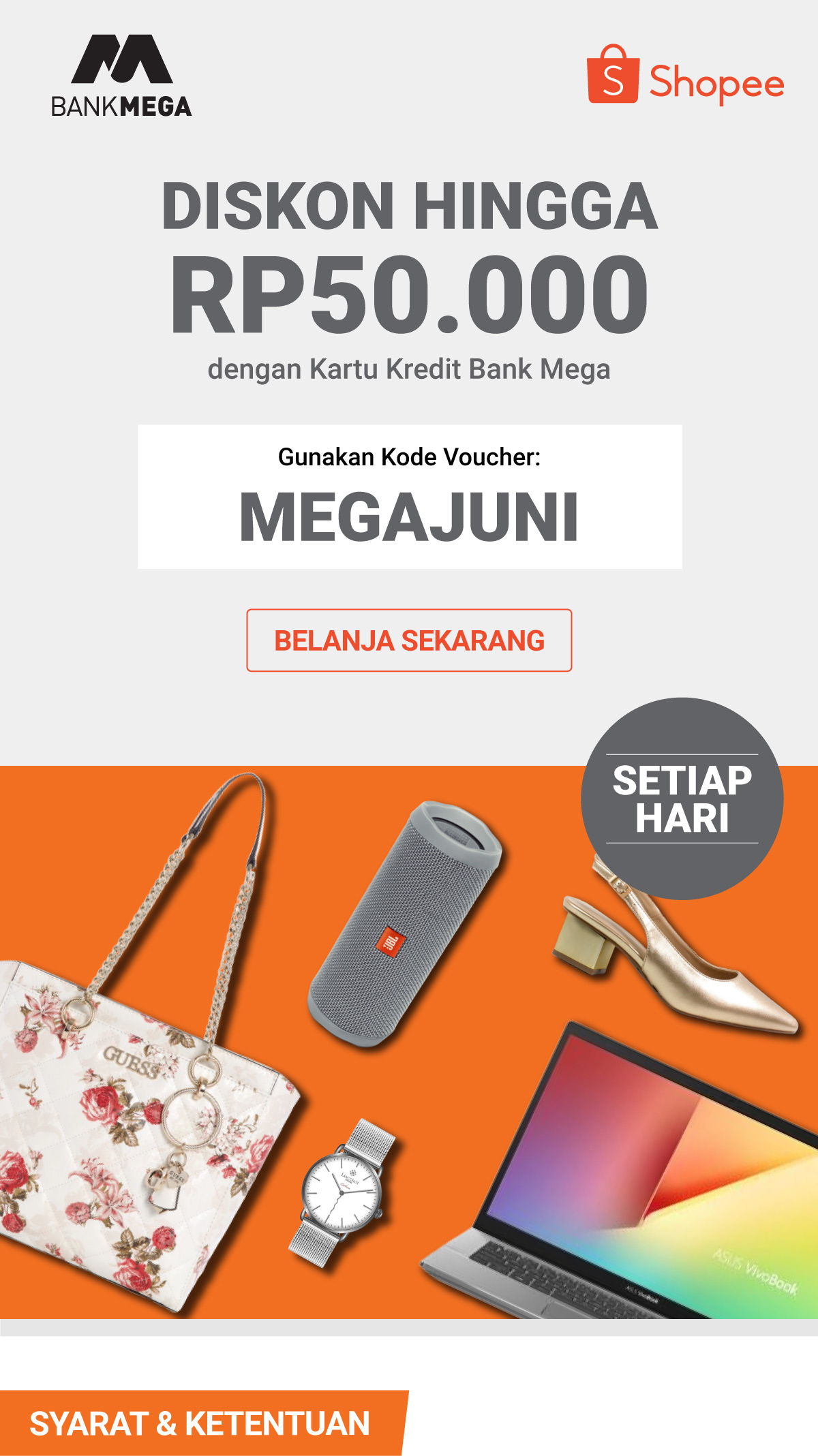 Promo - Bank Mega Kuota promo 50 transaksi per hari Senin (Kartu Kredit dan Kartu Debit) Kode promo MEGAMONDAY25 Diskon Rp 100.000,-Berlaku s/d 4 Januari 2021; Minimum transaksi Rp1.750.000,-Kuota promo 50 transaksi per hari Senin (Kartu Kredit dan Kartu Debit) Kode promo MEGAMONDAY10