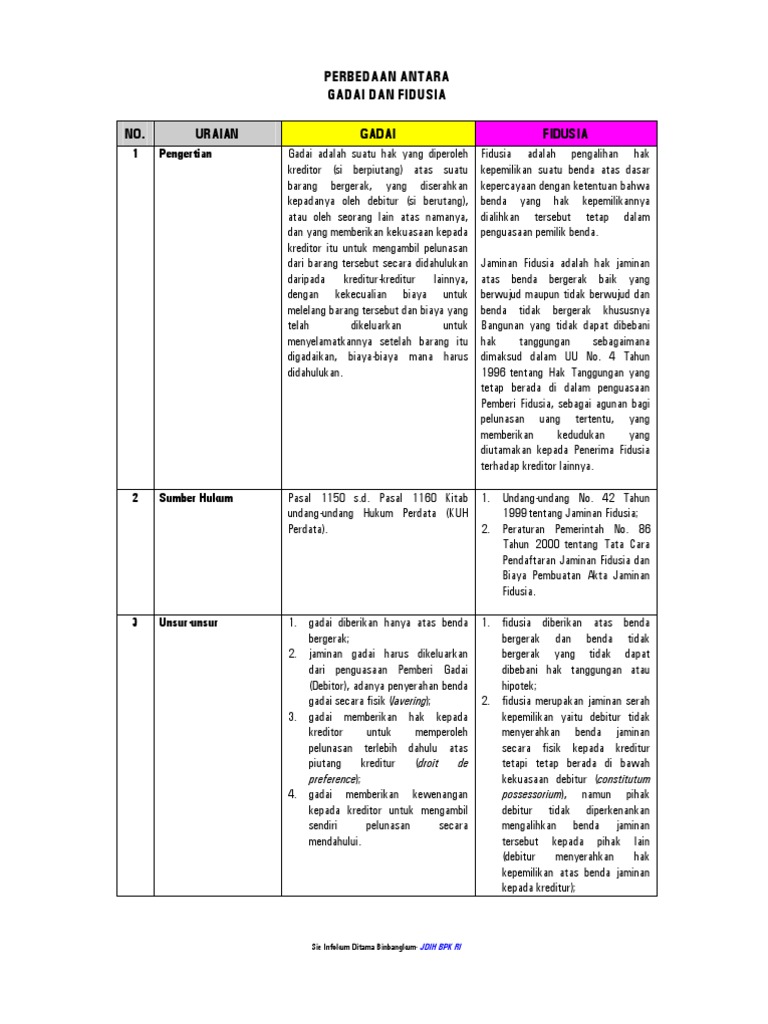 40 perbedaan gadai dan hipotik - Kelola Dana Anda Perbedaan gadai dan hipotik: • Gadai harus disertai dengan pernyataan kekuasaan atas barang yang digadaikan, sedangkan hipotik tidak. • Gadai hapus jika barang yang digadaikan berpindah tangan ke orang lain, sedangkan hipotik tidak, tetapi teap mengikuti bendanya walaupun bendanya... 2. Perbedaan Gadai, Fidusia, dan Hipotik - Blogger PERBEDAAN ANTARA GADAI , FIDUSIA , DAN HIPOTIK. 1. GADAI. A. Sumber Hukum Pasal 1150 s/d pasal 1160 kitab UU hukum perdata (KUHP Perdata) B. Kedudukan Benda Jaminan Secara Fisik berada di bawah penguasaan kreditur / pihak ketiga yang telah