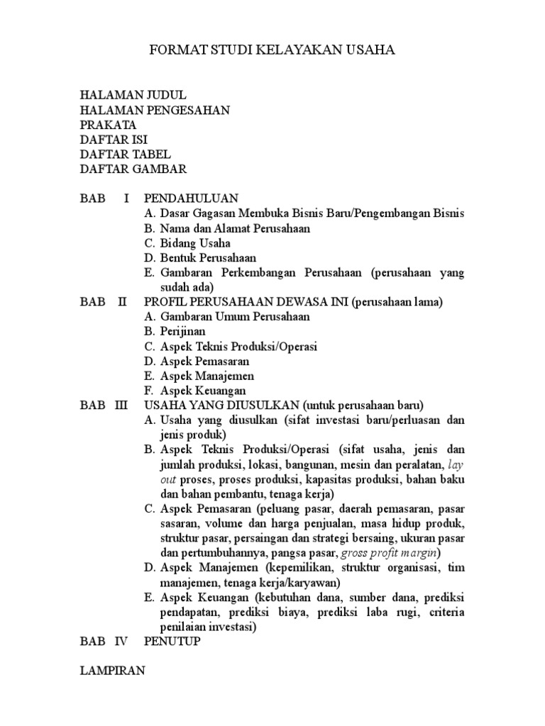 Contoh laporan studi kelayakan bisnis jasa. Jasa Studi Kelayakan: Contoh Studi Kelayakan Usaha - Grapadi Konsultan Jasa studi kelayakan pada berbagai bisnis yang ada. Jika Anda mengelompokkan pada kategori dan juga penerapan terhadap bisnis nya, maka terdapat contoh-contoh yang menggambarkan studi kelayakan bisnis itu sendiri seperti hal yang berikut ini: Bisnis properti. Contoh Laporan Studi Kelayakan Bisnis Jasa Pengelola Kek Contoh laporan studi kelayakan bisnis jasa pengelola kek. Jangka waktu beroperasinya KEK dan rencana strategis pengembangan KEK. Perusahaan penyedia jasa transportasi kereta api saat ini harus menyesuaikan kebutuhan penggunanya termasuk menyesuaikan gaya hidup penggunanya. Hasil suatu tudi kelayakan bisnis jasa hendaknya disajikan dalam laporan ... Contoh Makalah Studi Kelayakan Bisnis - Makalah Contoh Makalah Studi Kelayakan Bisnis - Makalah. masing-masing. Apalagi sekarang ini dunia bisnis sudah menggunakan alat-alat. usahanya. manusia. Contoh lainnya seperti menjamurnya internet yang memberikan. berbagai informasi tanpa batas. Untuk itu diperlkukan pengetahuan yang luas. tentang teknologi. Contoh Laporan Studi Kelayakan Bisnis Pdf - Gaya Modis Contoh Laporan Studi Kelayakan Bisnis Jasa Kumpulan Contoh Tujuan utama dilakukannya studi kelayakan bisnis adalah agar usaha yang didirikan sesuai dengan harapan dan dapat bertahan lama. Contoh proposal usaha jasa travel. SELI NURBAETI S 2013 54 016 2.