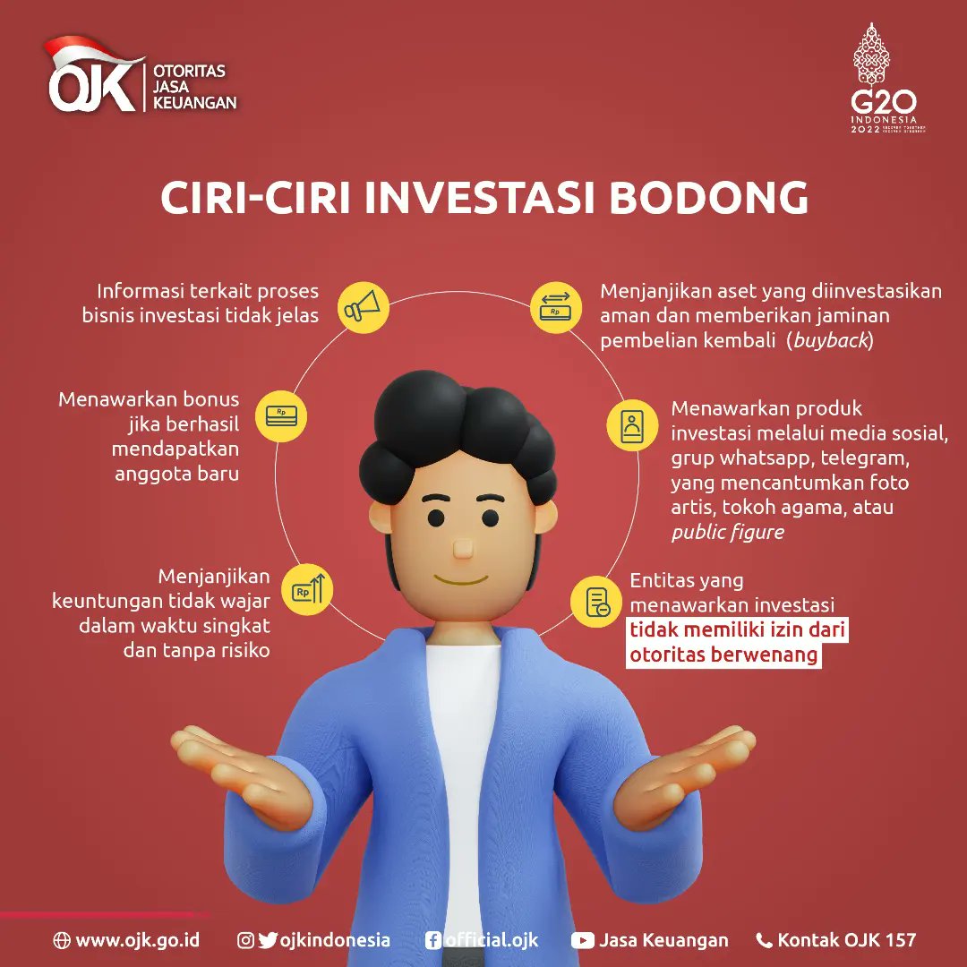 Bagaimana Ciri-ciri Investasi Bodong? Ini Penjelasan dari OJK Ciri-ciri investasi bodong menurut OJK: 1. Imbal hasil yang di luar batas kewajaran dalam waktu singkat 2. Penekanan utama pada perekrutan 3. Tidak dijelaskan bagaimana cara mengelola investasinya 4. Tidak dijelaskan underlying usaha yang memenuhi asas kewajaran dan kepatutan di sektor investasi keuangan 5. Ciri Investasi Bodong: 7 Poin yang Wajib Dipahami - Glints ... Ciri investasi bodong yang pertama adalah adanya janji untuk memberikan keuntungan yang sangat besar. Misalnya, 5% per bulan atau 60% per tahun. Selain keuntungan yang sangat besar, angka penyetoran uang minimalnya juga sangat kecil. Contohnya adalah membayar hanya 3,7 juta untuk berangkat ibadah umrah dengan skema investasi. Waspada Investasi Bodong: Pengertian, Jenis, dan Ciri-Ciri ... Nah, dilansir dari laman Satuan Tugas Waspada Investasi OJK, ciri-ciri money game yang menjadi investasi bodong dan perlu diwaspadai, yaitu: Tidak ada produk atau jasa yang dijual. Jika pun ada, produk dan jasa tersebut dijual dengan harga yang tidak sesuai. Semuanya hanya sebagai kedok dari bisnisnya. Hati-hati! Ini 4 Ciri Investasi Bodong dan Cara Menghindarinya Ciri investasi bodong lainnya adalah adanya iming-iming akan hidup mewah dengan banyak kesempatan mendapatkan keuntungan dan bonus. Hal ini biasanya dilakukan untuk membangun kepercayaan target. Modus investasi bodong satu ini juga sering menyeret tokoh-tokoh besar seakan-akan mereka sudah berhasil setelah mengikuti investasi ini.