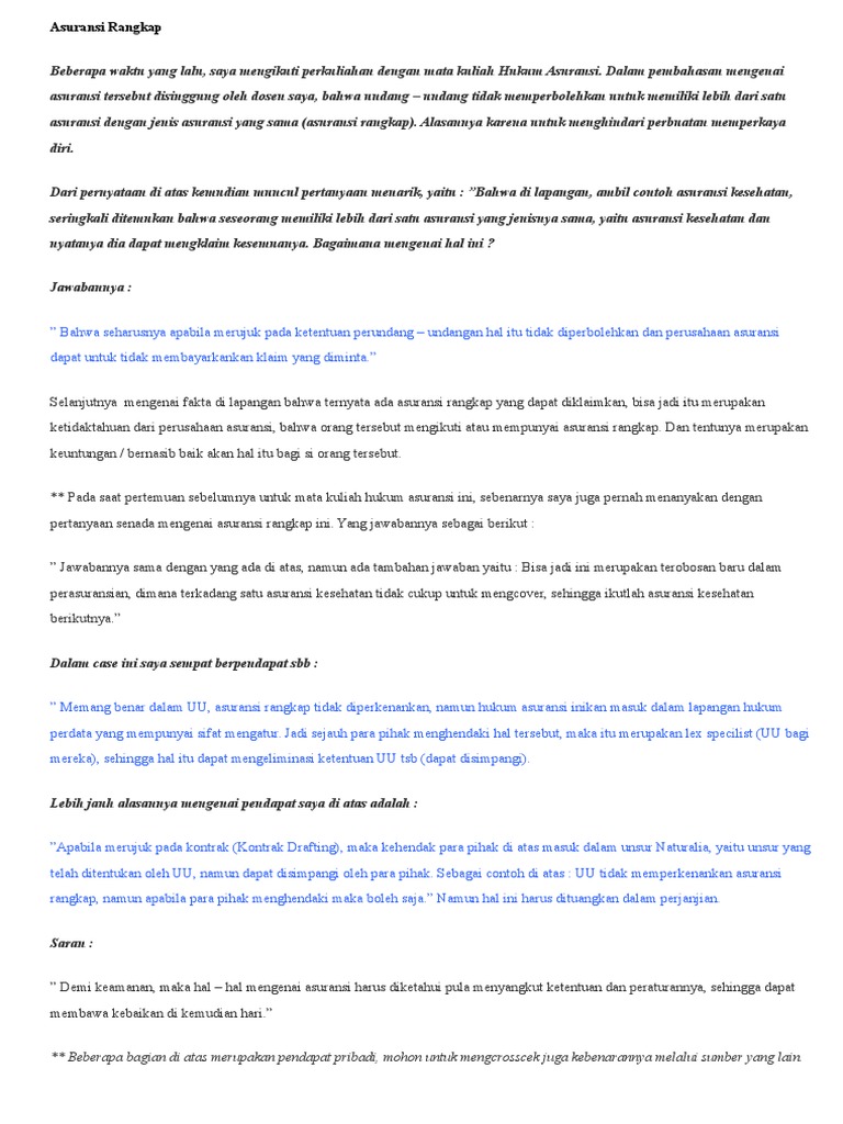 Soal Ujian AAMAI - 102 Hukum Asuransi (Tanya Jawab ... Soal Ujian AAMAI - 102 Hukum Asuransi (Tanya Jawab) Bagian I 1. Uraikan apa yang dimaksud dengan perikatan. Perhubungan hukum antara 2 orang atau 2 pihak, berdasarkan mana pihak yang satu berhak menuntut suatu hal dari pihak yang lain dan pihak yang lain berkewajiban untuk memenuhi tuntutan itu. 2. Uraikan privity of contract menurut hukum Inggris.