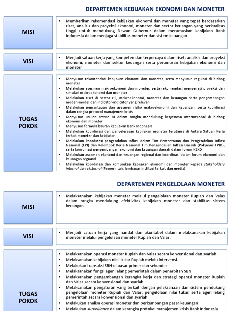 › id › tentang-biProfil - Bank Indonesia Babak baru dalam sejarah Bank Indonesia sebagai Bank Sentral yang independen dalam melaksanakan tugas dan wewenangnya dimulai ketika sebuah undang-undang baru, yait u UU No. 23/1999 tentang Bank Indonesia, dinyatakan berlaku pada tanggal 17 Mei 1999 dan sebagaimana telah diubah dengan Undang-Undang Republik Indonesia No. 6/ 2009. Hadiri Buka Puasa Bersama, Asisten Bidang Pemerintahan dan ... PROFIL - Sejarah - Visi dan Misi - Profil Kepala Daerah - Sekretariat Daerah. Sekretaris Daerah; Asisten Pemerintahan dan Kesejahteraan Rakyat Sekretariat Daerah Provinsi Kalimantan Tengah › id › layananMuseum BI - Bank Indonesia Visi dan Misi. Visi. Menjadi wahana sumber informasi tentang sejarah Bank Sentral Indonesia yang terpercaya, informatif, modern dan menarik yang dikelola secara ... Pansel Putuskan 3 Kandidat Calon Sekda Jatim, Begini ... BuzzFeed - Pengurus Dewan Pimpinan Daerah (DPD) Gerakan Mahasiswa Nasional Indonesia (GMNI) Jawa Timur (Jatim), Tiar Geseng Gumilang biasa akrab diapnggil Bung Kandar apresiasi kinerja Panitia Seleksi (Pansel) yang telah mengumumkan 3 kandidat calon yang akan mengisi jabatan di Sekretaris Daerah (Sekda) Provinsi Jatim. Menurutnya, keputusan yang dikeluarkan oleh Pansel sudah memenuhi standar ...