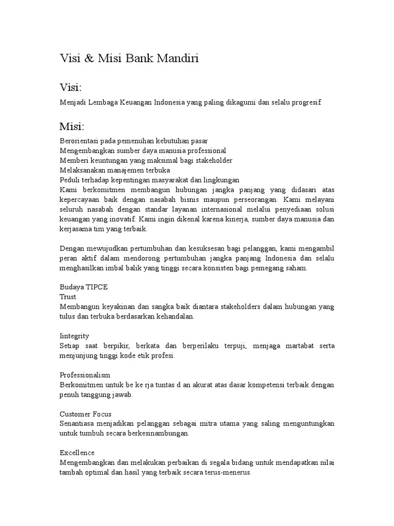 Visi Misi - Bank Mandiri Visi. Menjadi partner finansial pilihan utama Anda. Misi. Menyediakan solusi perbankan digital yang handal dan simple yang menjadi bagian hidup nasabah. Nilai-nilai Utama. Amanah Memegang teguh kepercayaan yang diberikan. Kompeten Terus belajar dan mengembangkan kapabilitas. Harmonis Saling peduli dan menghargai perbedaan. Loyal
