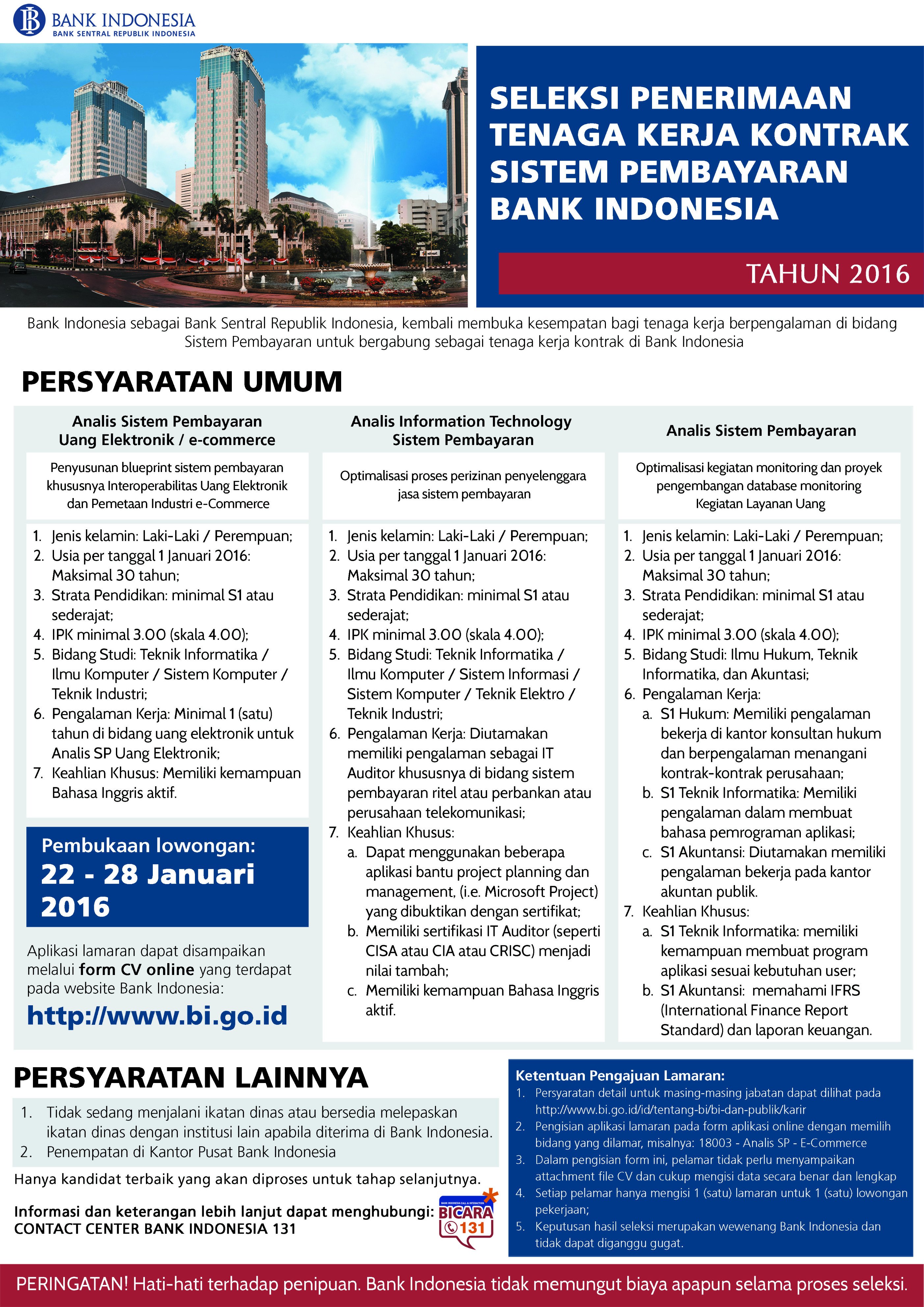 Bank Indonesia Buka Lowongan Kerja, Ini Linknya - Kabar24 ... Sementara itu, Penerimaan Tenaga Kerja PKWT merupakan jalur penerimaan Tenaga Kerja yang dipekerjakan oleh Bank Indonesia dalam jangka waktu tertentu berdasarkan perjanjian kerja. Khusus rekrutmen PKWT dibutuhkan SDM yang memiliki kompetensi spesifik dan pengalaman kerja di bidang teknologi informasi yang sesuai dengan kebutuhan Bank Indonesia.